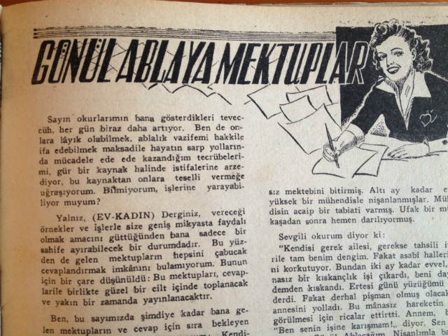 “Kendisi gerek ailesi, gerekse tahsili itibarile tam benim dengim. Fakat asabi halleri beni korkutuyor. Bundan iki ay kadar evvel, mânasız bir kıskançlık işi çıkardı, beni dayızademden kıskandı. Ertesi günü yüzüğümü gönderdi. Fakat derhal pişman olmuş olacak ki, annesini yolladı. Bu mânasız hareketin hoş görülmesi için ricalar ettirtti. Annem, bana: “Ben senin işine karışmam!” diyor. Sen bir akıl ver Gönül Ablacığım. Nişanlımla barışayım mı, evlenirsem bahtiyar olur muyum?”